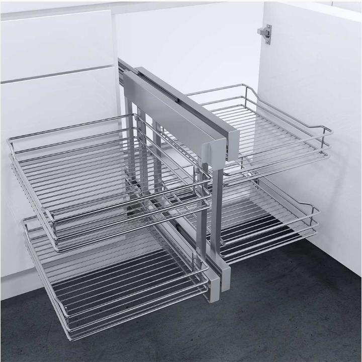 Flex Corner ersätter tidigare Magic Corner. Samma egenskaper, bättre kvalité och du slipper hålla reda på vänster och höger. Flex Corner har integrerad dämpning och störst förvaringsyta av alla förvaringslösningarna. Passar både vänster och höger. Varje hyllplan klarar 8kg. Alla korgar kommer helt ut ur skåpet.