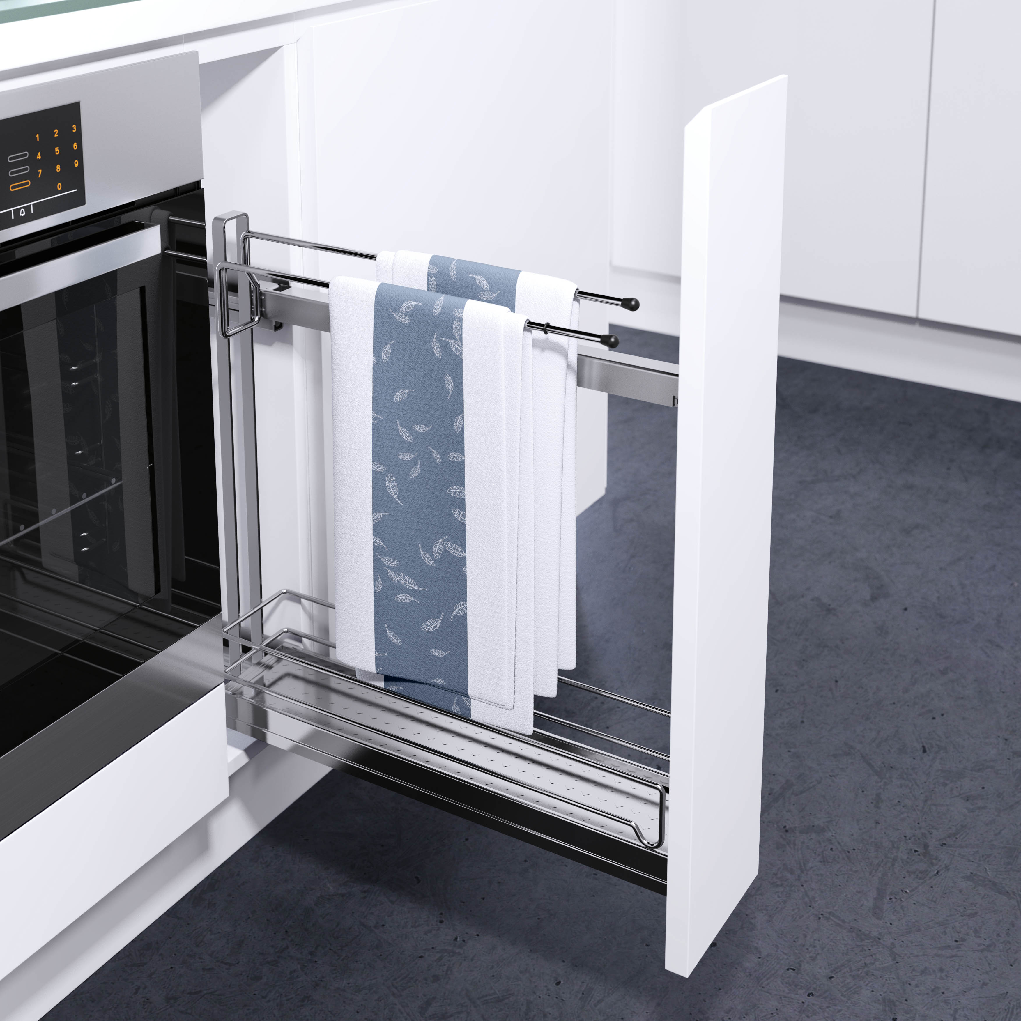 K-150 glider stabilt på dämpade skenor från Grass. Med en enkel injustering kan skåpsluckan anpassas i alla tre riktningar. Avdelare för t.ex flaskor säljs separat. Varje hyllplan klarar en belastning på 6 kg.